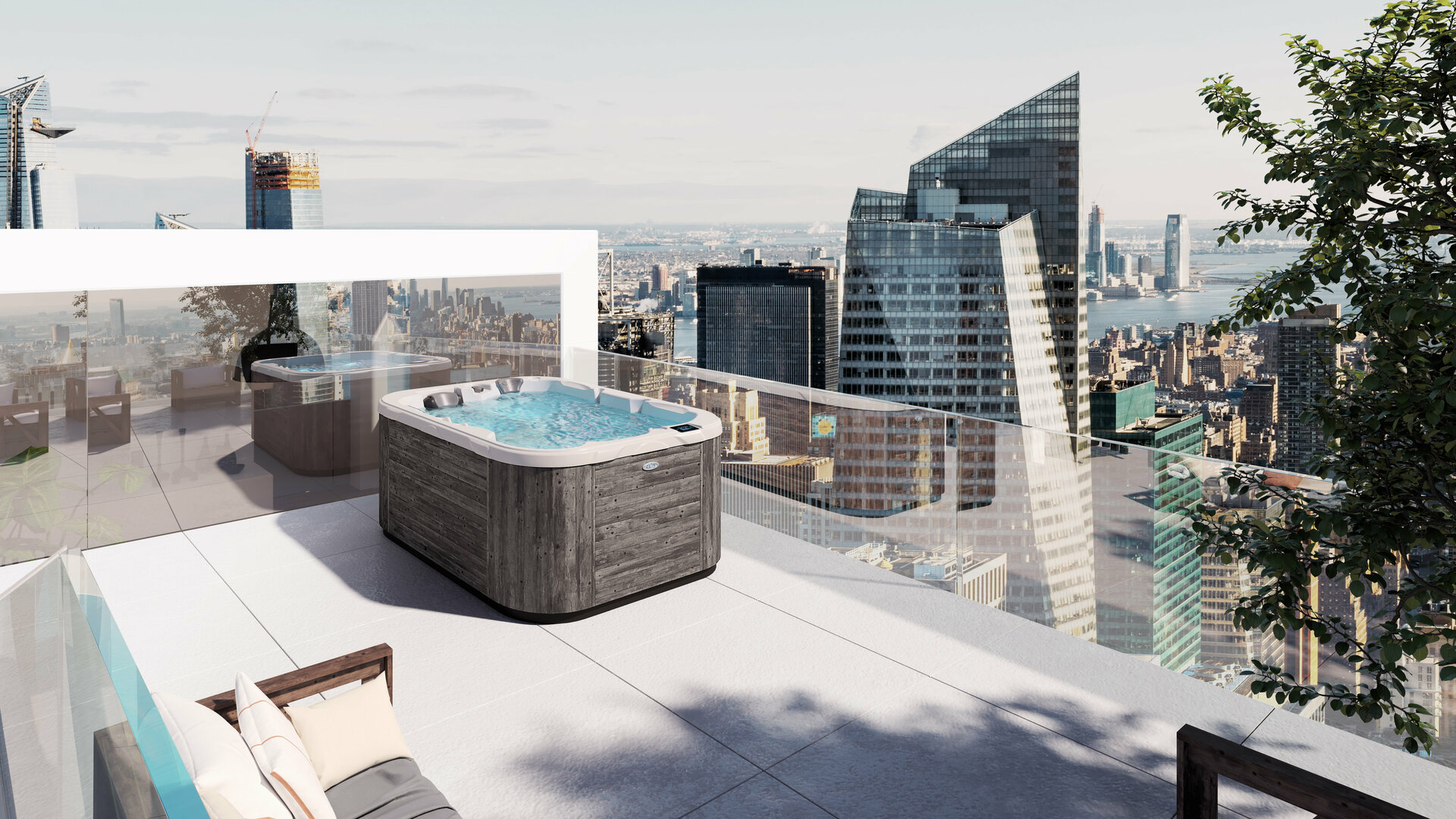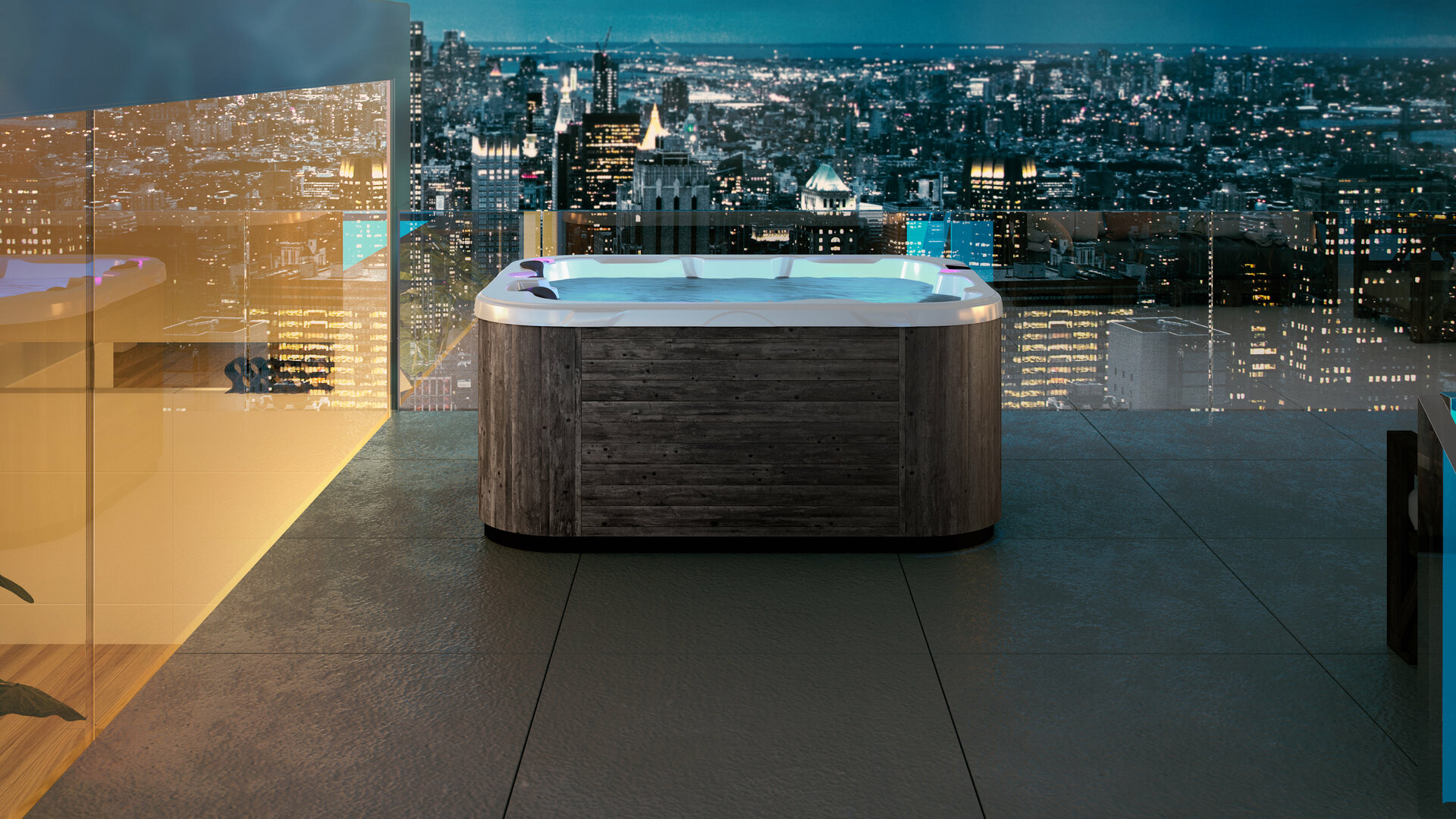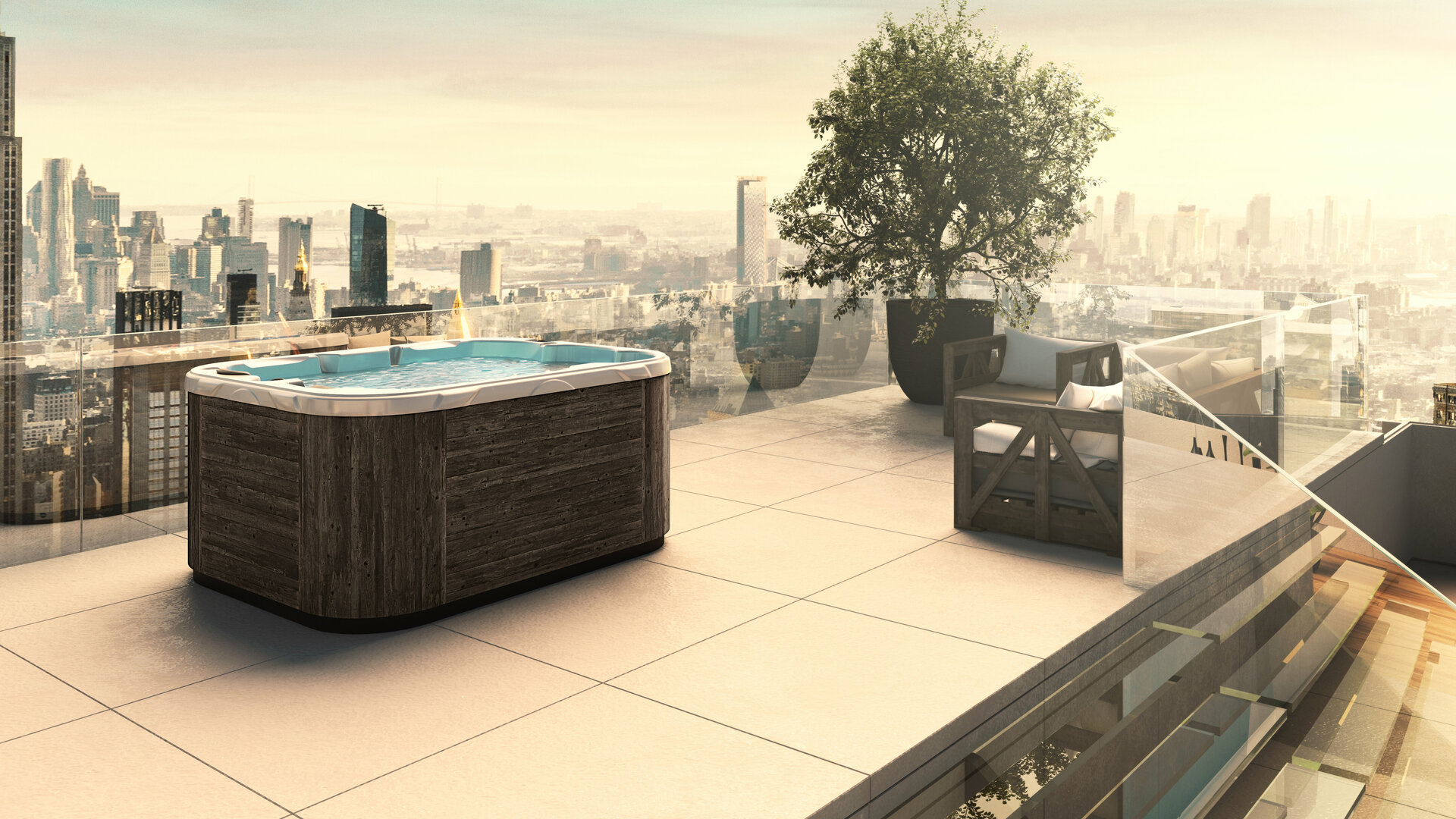 Das Whirlpool-Modell TRIAD 91 ist optional mit der Terracina Umrandung und der Smart-TubTM-App erhältlich.